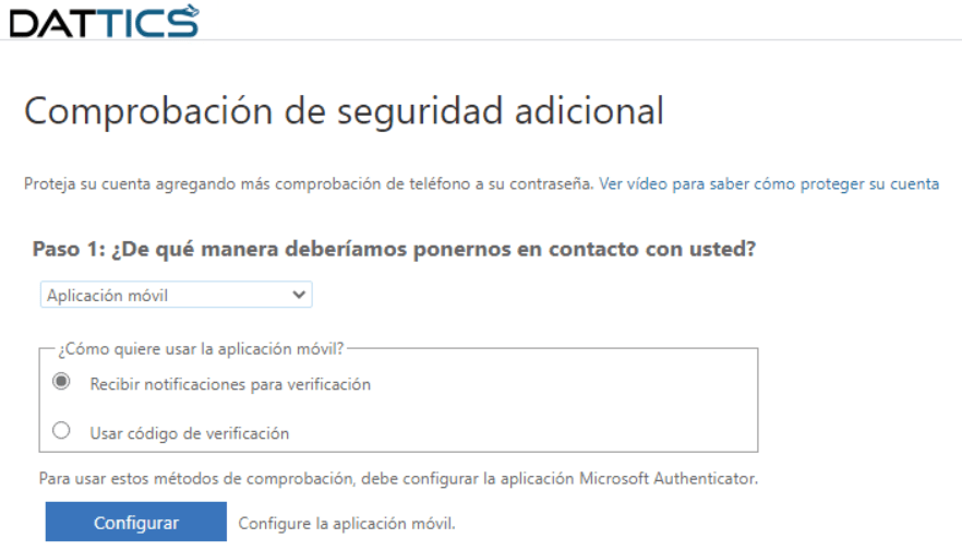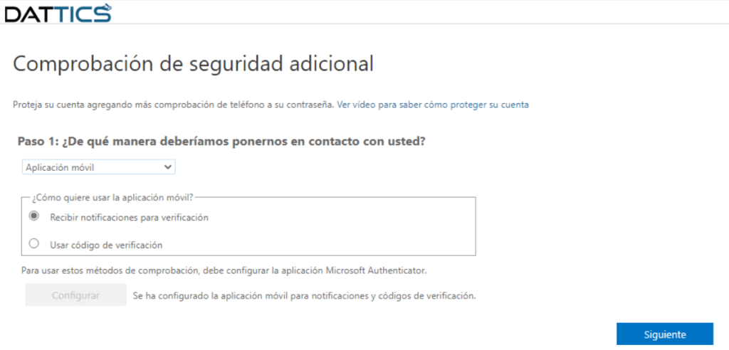 Podremos en este paso, seleccionar el método de autenticación adicional según lo haya permitido la empresa, recomendamos por seguridad y facilidad «Aplicación móvil».