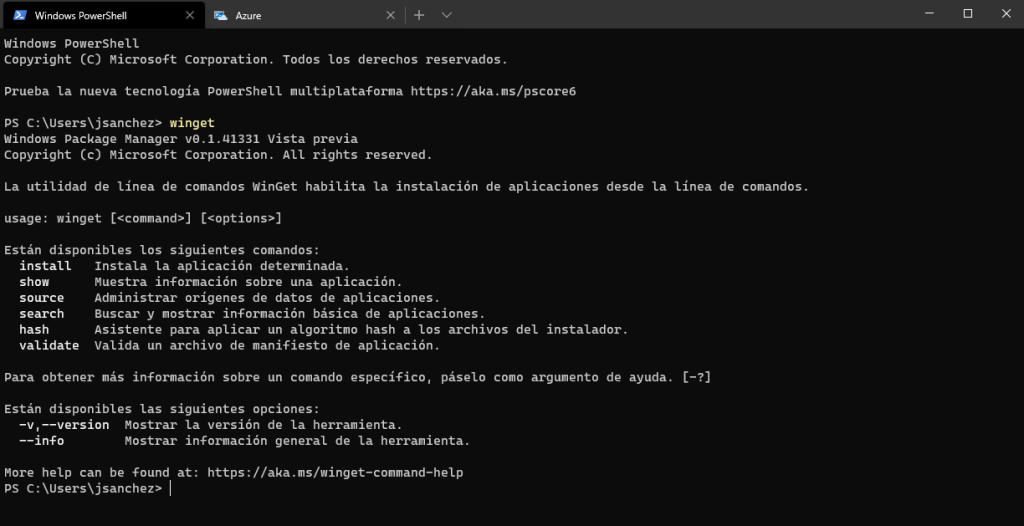 Tras unos minutos, procedemos a abrir la línea de comandos o la nueva Terminal de Windows e ingresamos winget, veremos que nos aparece la herramienta con sus opciones.