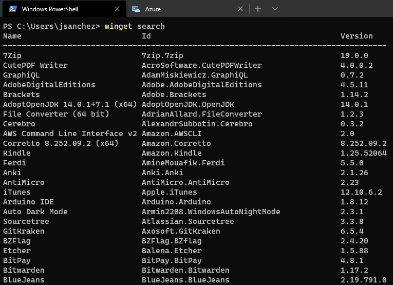 Si bien el producto es nuevo, ya cuenta con una amplia lista de aplicaciones para escoger, como por ejemplo, 7zip, Kindle, VLC, BlueJeans, Dropbox, Chrome, PowerBI Desktop, PowerToys, SQL Server Management Studios, Python, Postman y muchos más, si queremos ver toda la lista, ejecutamos el siguiente comando: