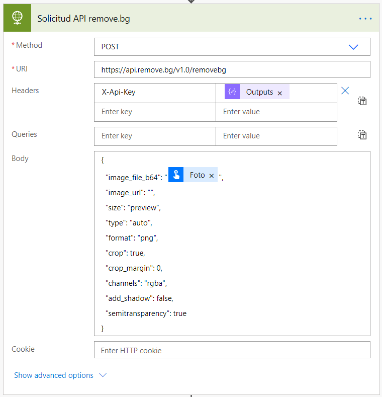 Dentro de los encabezados (Headers), debemos enviar uno llamado «X-Api-Key», el cual contiene la salida de nuestra acción anterior.