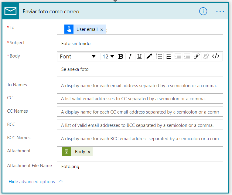 Tras este paso, enviaremos la foto por correo a la persona que inicia el flujo, sin embargo, se podrían por ejemplo guardar en Sharepoint, OneDrive, enviar a otro aplicativo, etc.