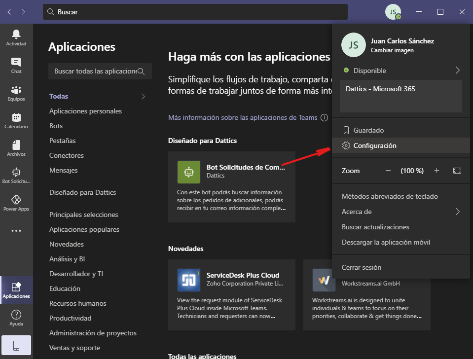 Primero, debemos abrir el menú de opciones haciendo clic en nuestra foto o iniciales en la barra superior de Teams.