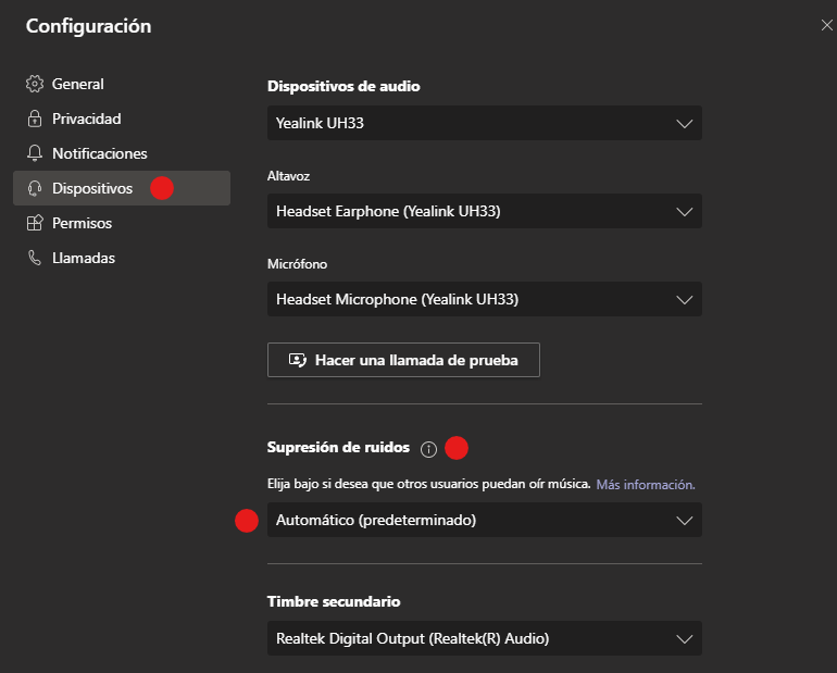 En el menú de configuración, hacemos clic en «Dispositivos» y allí podremos configurar el nivel de supresión de ruido deseado.